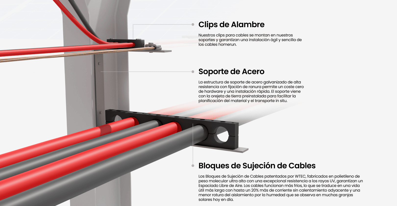 Los Bloques de Sujeción de Cables patentados de WTEC, fabricados con polietileno de ultra alto peso molecular y con excelente resistencia a los rayos UV, garantizan el Espaciado en Aire Libre. Cables más fríos significan mayor vida útil, hasta un 20% más de corriente sin calentamiento adyacente y menor degradación del aislamiento por humedad, como se observa en muchas plantas solares actualmente.